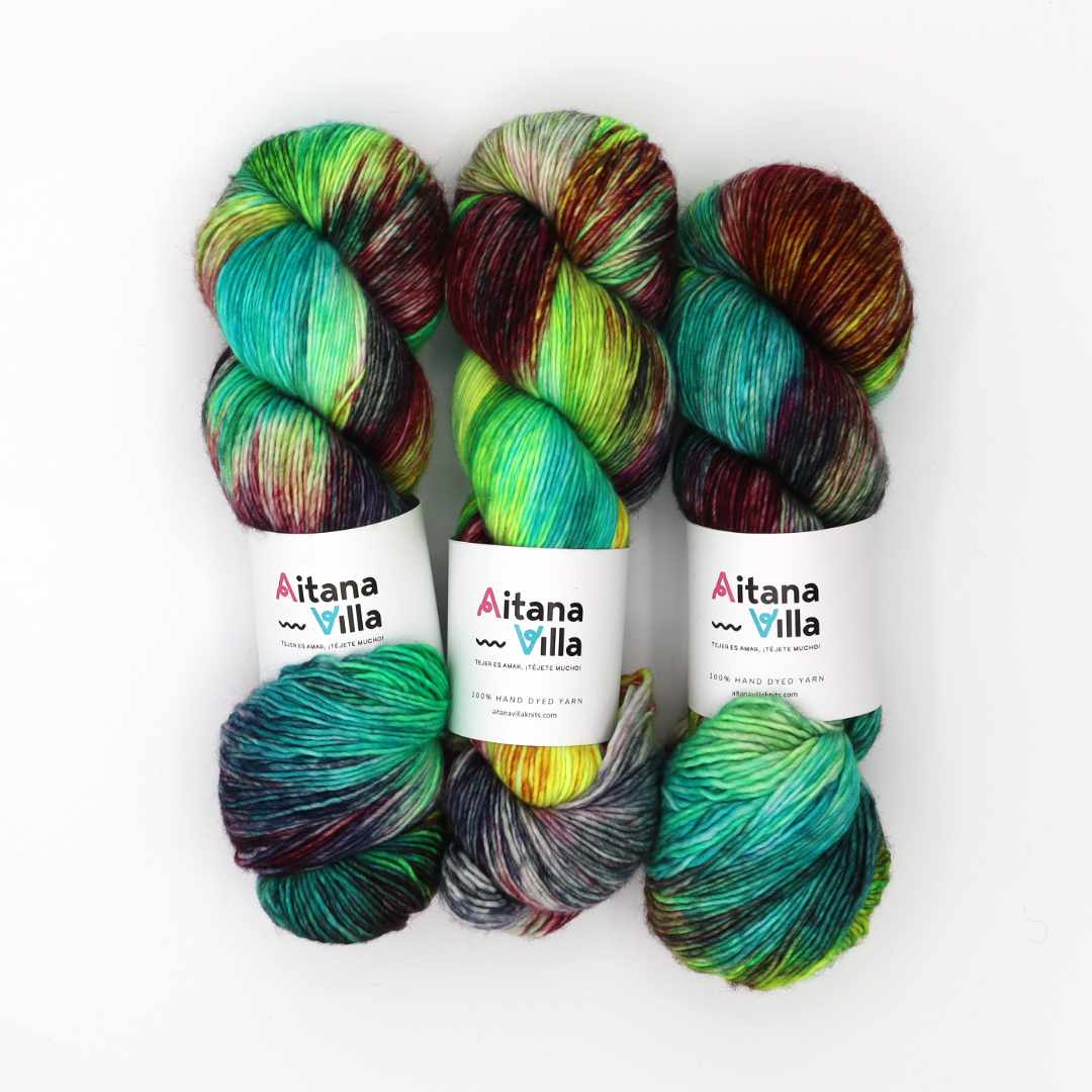 Katherine se tiñe a mano en pequeños lotes de 2 a 4 madejas, lo que aporta carácter único a cada pieza.