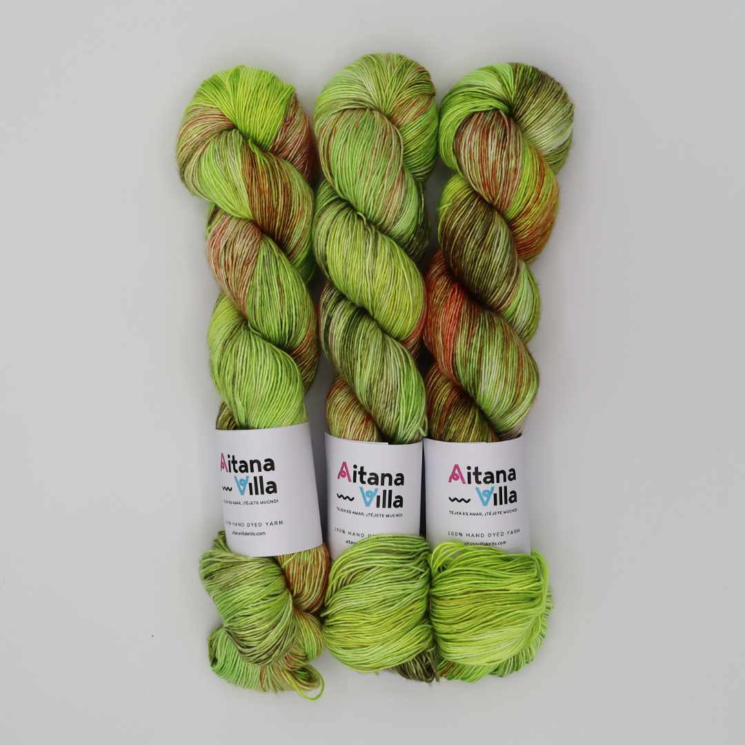 Cada madeja se tiñe a mano en lotes de 2 a 4 unidades. Esto significa que puede haber pequeñas variaciones de una madeja a otra, lo que aporta autenticidad y belleza a tu proyecto.