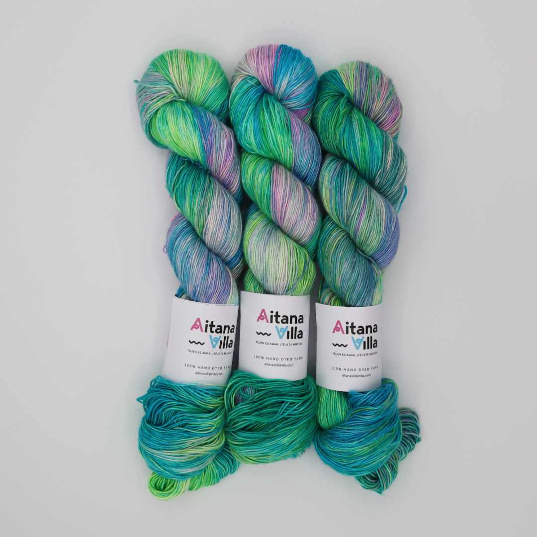 Cada madeja se tiñe a mano en lotes de 2 a 4 unidades. Esto significa que puede haber pequeñas variaciones de una madeja a otra, lo que aporta autenticidad y belleza a tu proyecto.