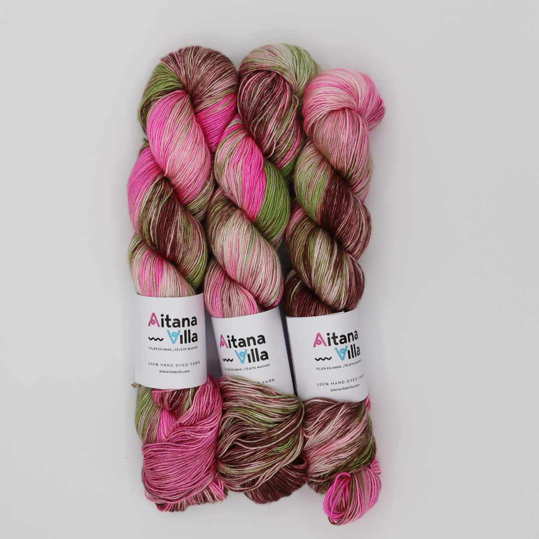 Cada madeja se tiñe a mano en lotes de 2 a 4 unidades. Esto significa que puede haber pequeñas variaciones de una madeja a otra, lo que aporta autenticidad y belleza a tu proyecto.