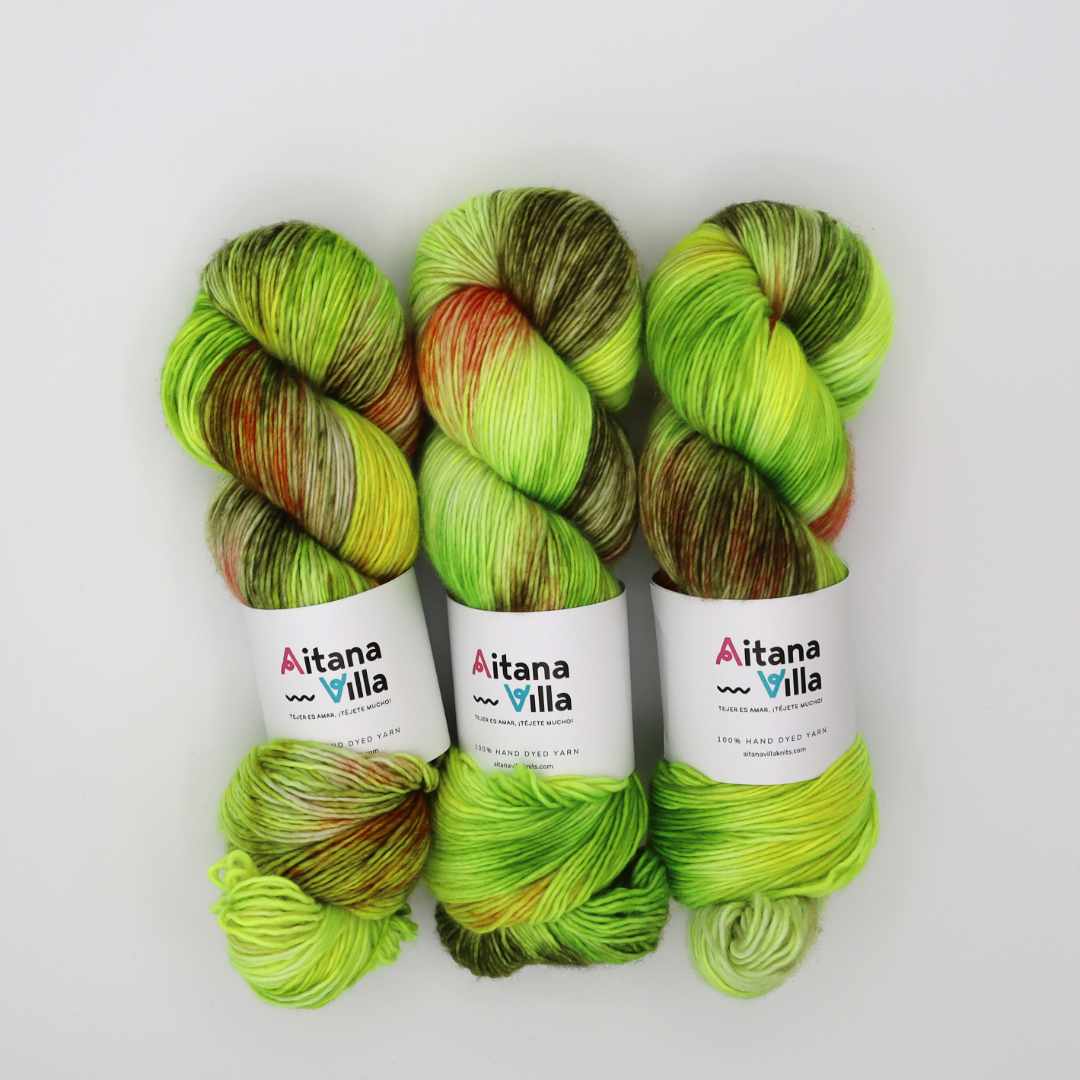 Katherine se tiñe a mano en pequeños lotes de 2 a 4 madejas, lo que aporta carácter único a cada pieza.