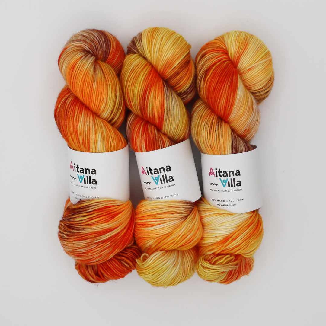 Katherine se tiñe a mano en pequeños lotes de 2 a 4 madejas, lo que aporta carácter único a cada pieza.