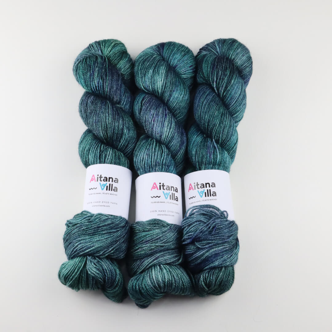 Es una lana teñida a mano en lotes de 2 a 4 madejas por lo que puede haber una pequeña variabilidad de una madeja a otra por lo que es aconsejable intercalar madejas en los proyectos de mayor tamaño.