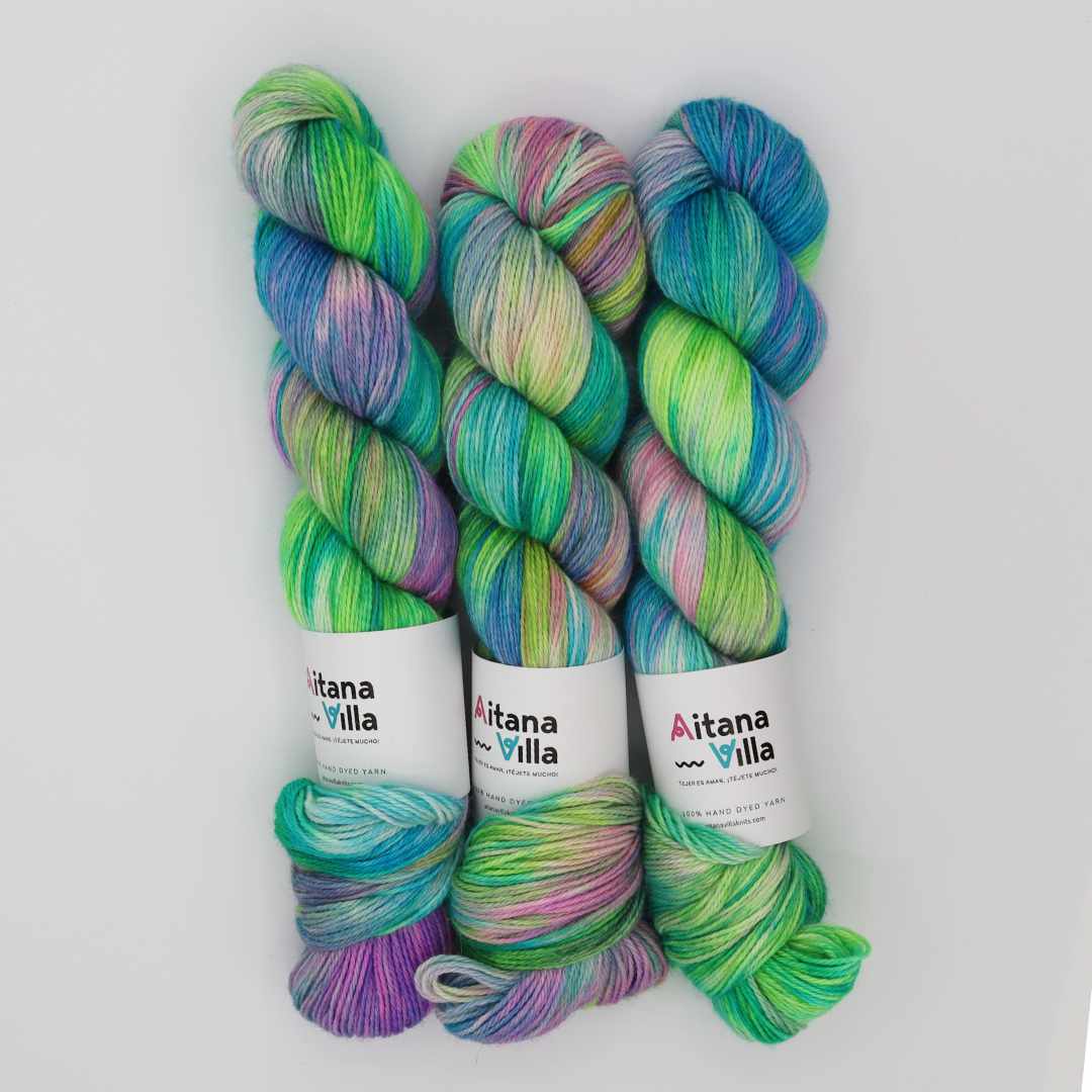 Rosalind se tiñe a mano en pequeños lotes de 2 a 4 madejas, lo que hace que cada una sea única.