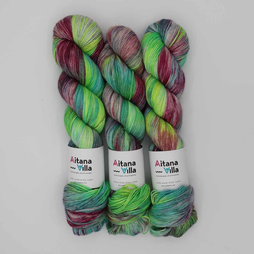 Rosalind se tiñe a mano en pequeños lotes de 2 a 4 madejas, lo que hace que cada una sea única.